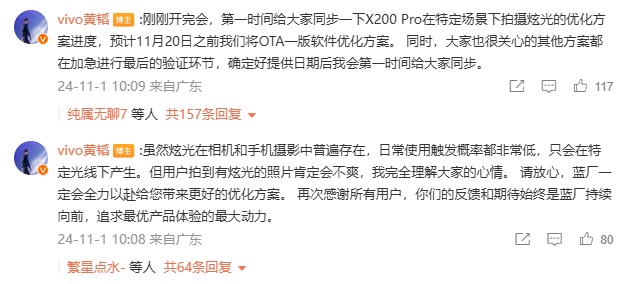 文章来源于互联网:IT之家-vivo 黄韬:预计 11 月 20 日前 OTA 优化 X200 Pro 拍照炫光问题