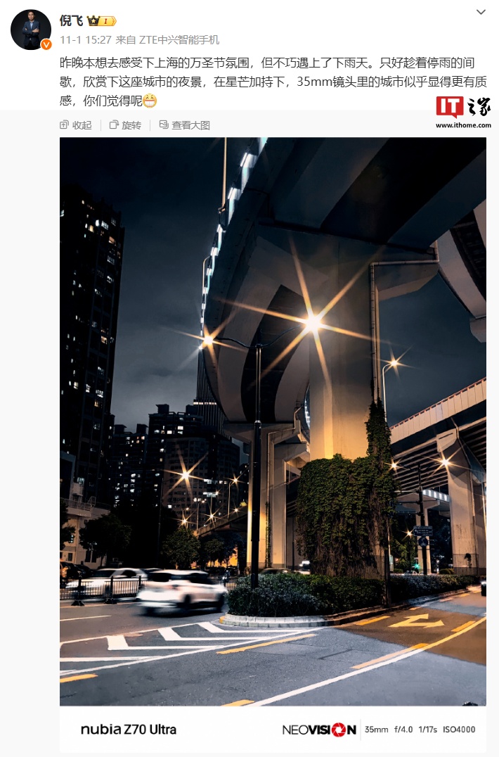 IT之家 11 月 3 日消息,努比亚在今年 10 月 31 日官宣 Z70 Ultra 全面屏手机“11 月见”,中兴通讯终端事业部总裁、努比亚技术有限公司总裁倪飞现公布新机拍摄样张。