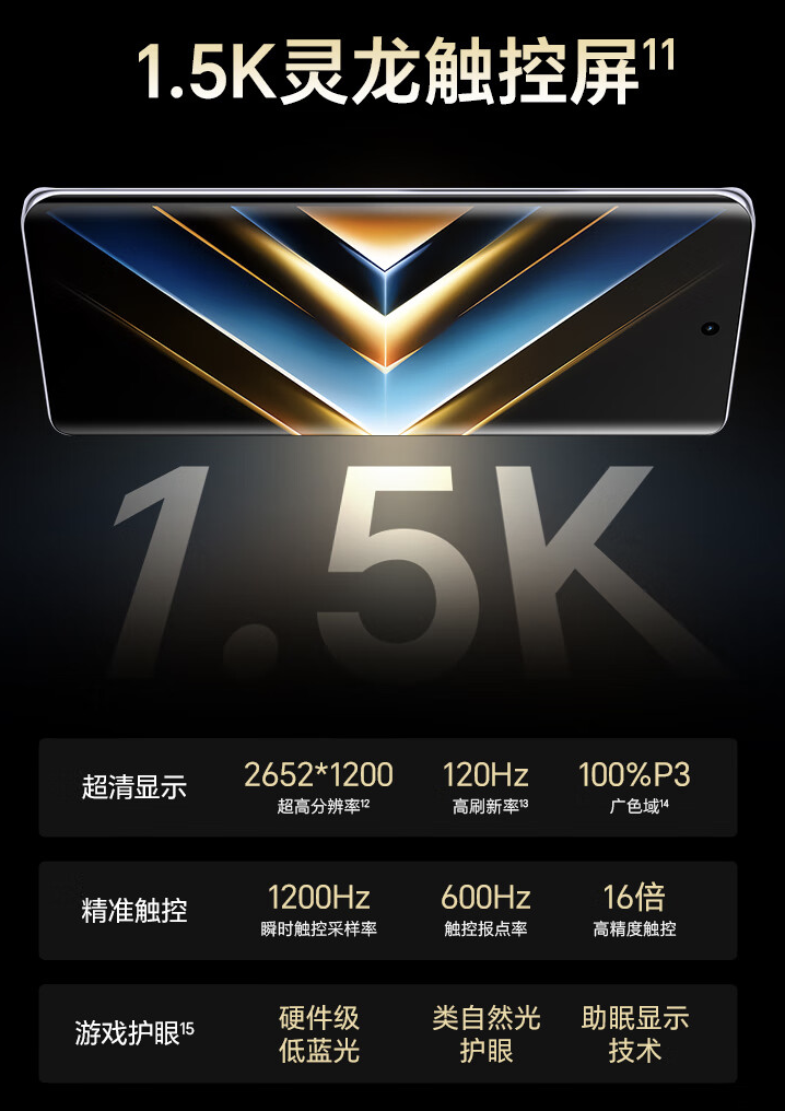 屏幕方面,荣耀 X50 GT 采用 6.78 英寸 2652×1200 OLED 双曲屏,全局最高亮度 1000nit、局部峰值亮度最高 1200nit,支持 120Hz 刷新率,灵龙触控引擎、600Hz 触控报点率、1200Hz 瞬时触控采样率,采用 1920Hz 高频 PWM 调光,支持类自然光护眼、助眠显示、10.7 亿色。