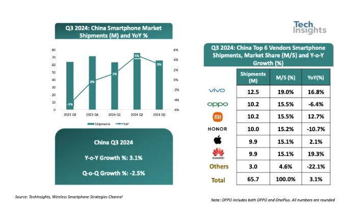 文章来源于互联网:IT之家-Techinsights:2024 年 Q3 中国智能手机出货量同比增长 3%, vivo 领跑