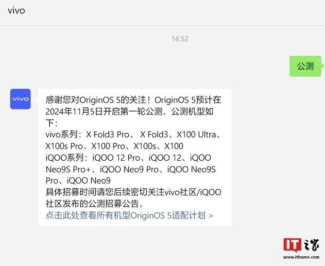 IT之家 11 月 4 日消息,IT之家从 vivo 官方服务号获悉,OriginOS 5 预计在 2024 年 11 月 5(明)日开启第一轮公测。