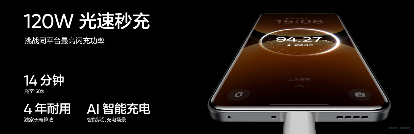 新机还支持“120W 光速秒充”,号称 14 分钟充至 50%,内置 4 年耐用独家长寿算法、支持 AI 智能充电。