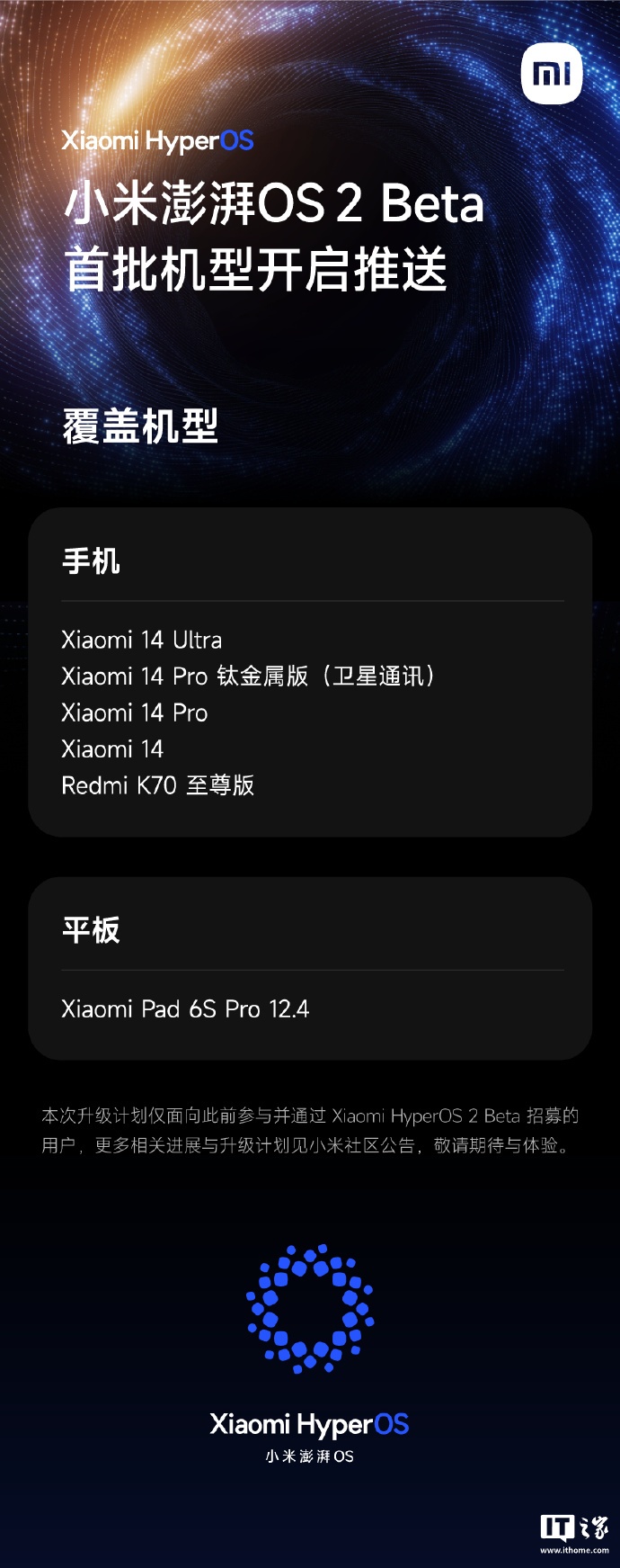 IT之家 11 月 4 日消息,小米 14 系列手机已于本月获推澎湃 HyperOS 2 系统 Beta 版升级(限已通过 Beta 版招募的用户)。除该系列机型外,还有 Redmi K70 至尊版、小米 Pad 6S Pro。