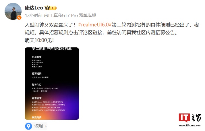 IT之家 11 月 5 日消息,realme UI 6.0 第二轮用户内测体验招募将于今日 10:00 启动,适配真我 GT Neo6、真我 GT5、真我 GT Neo6 SE、真我 GT5 240W 四款机型,真我 realme UI 产品经理 @康达Leo 昨日发文公布此次内测招募细则。