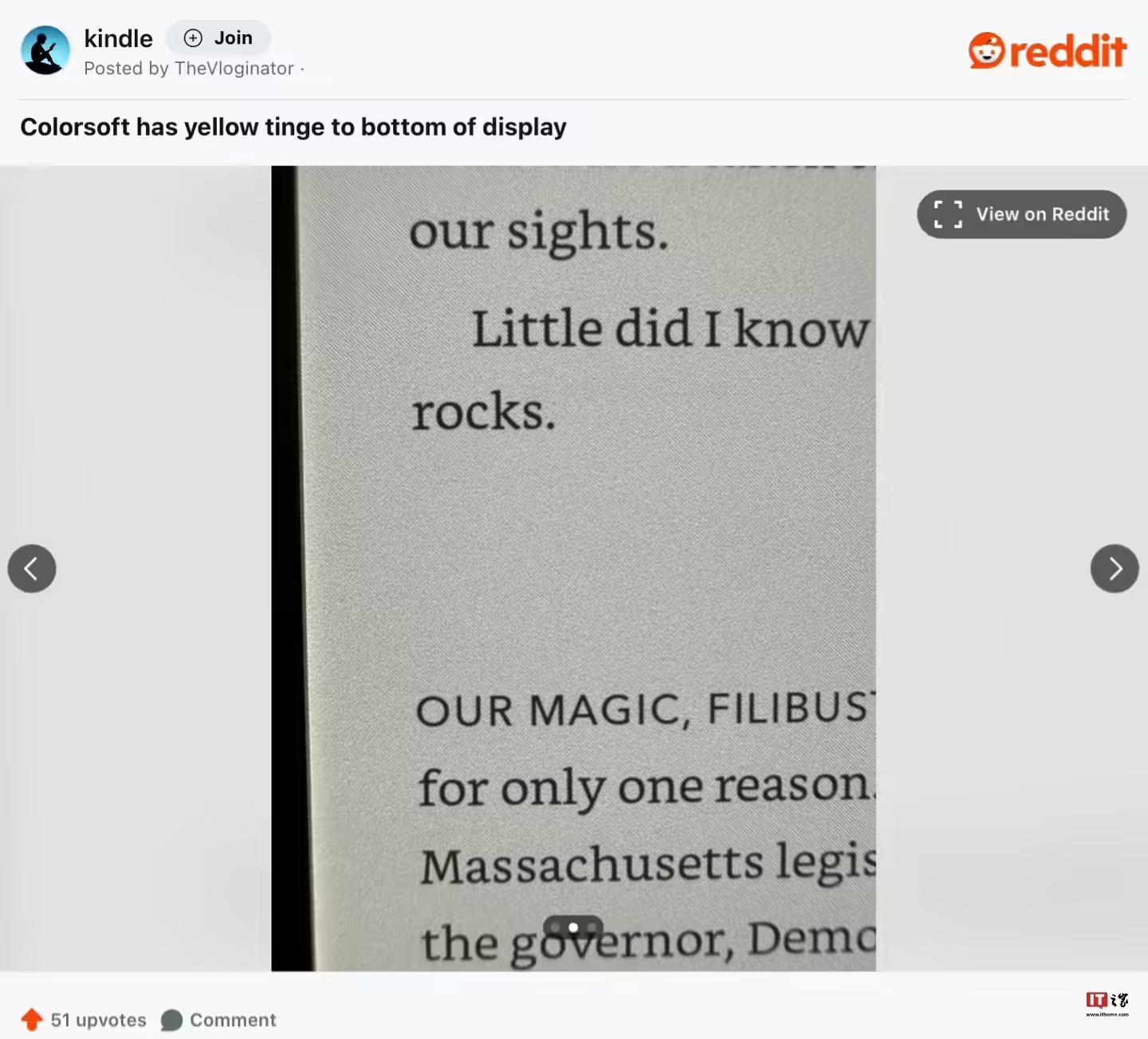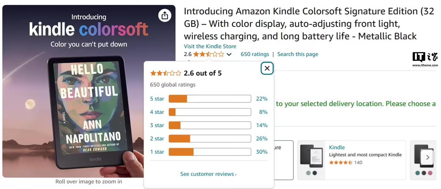 截至IT之家发文,Kindle Colorsoft 在亚马逊网站上的平均评分为 2.6 星(满分 5 星),其中多条评价都指出了该阅读器的“背光不均”问题。
