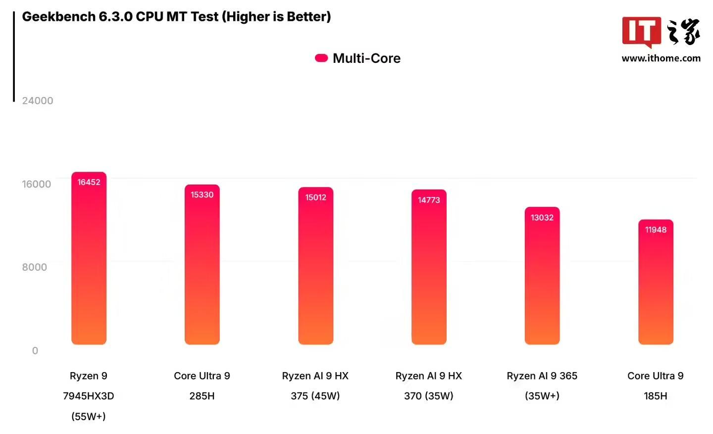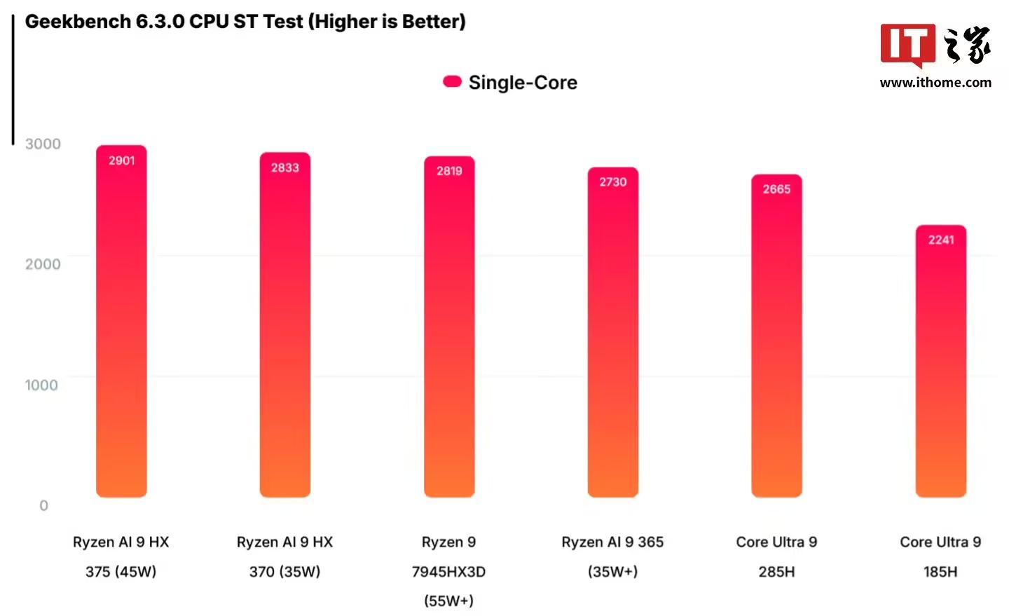 相比 AMD Ryzen AI 9 HX 370,英特尔酷睿 Ultra 9 285H 在单核性能上稍显落后,但在多线程性能上更快。IT之家援引该媒体报道,附上相关跑分对比图如下: