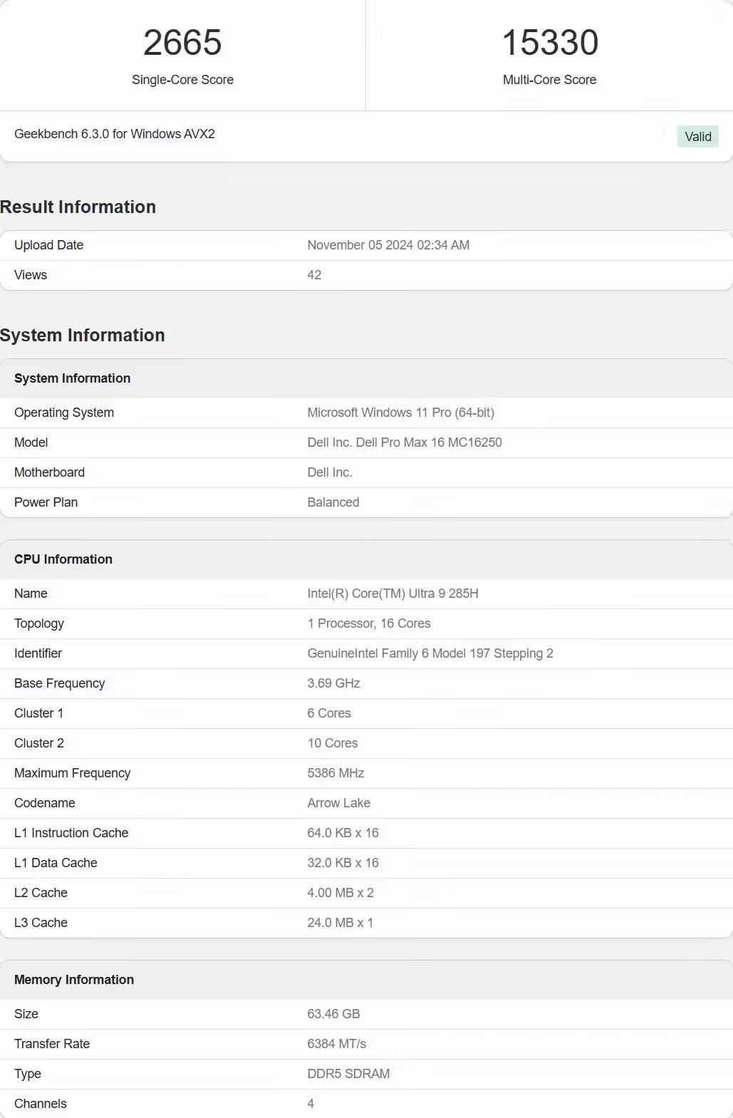 IT之家 11 月 5 日消息,科技媒体 WccfTech 今天(11 月 5 日)发布博文,报道称英特尔酷睿 Ultra 9 285H “Arrow Lake”处理器已现身 GeekBench 跑分库,6.3.0 版本单核成绩 2665 分,多核成绩 15330 分。