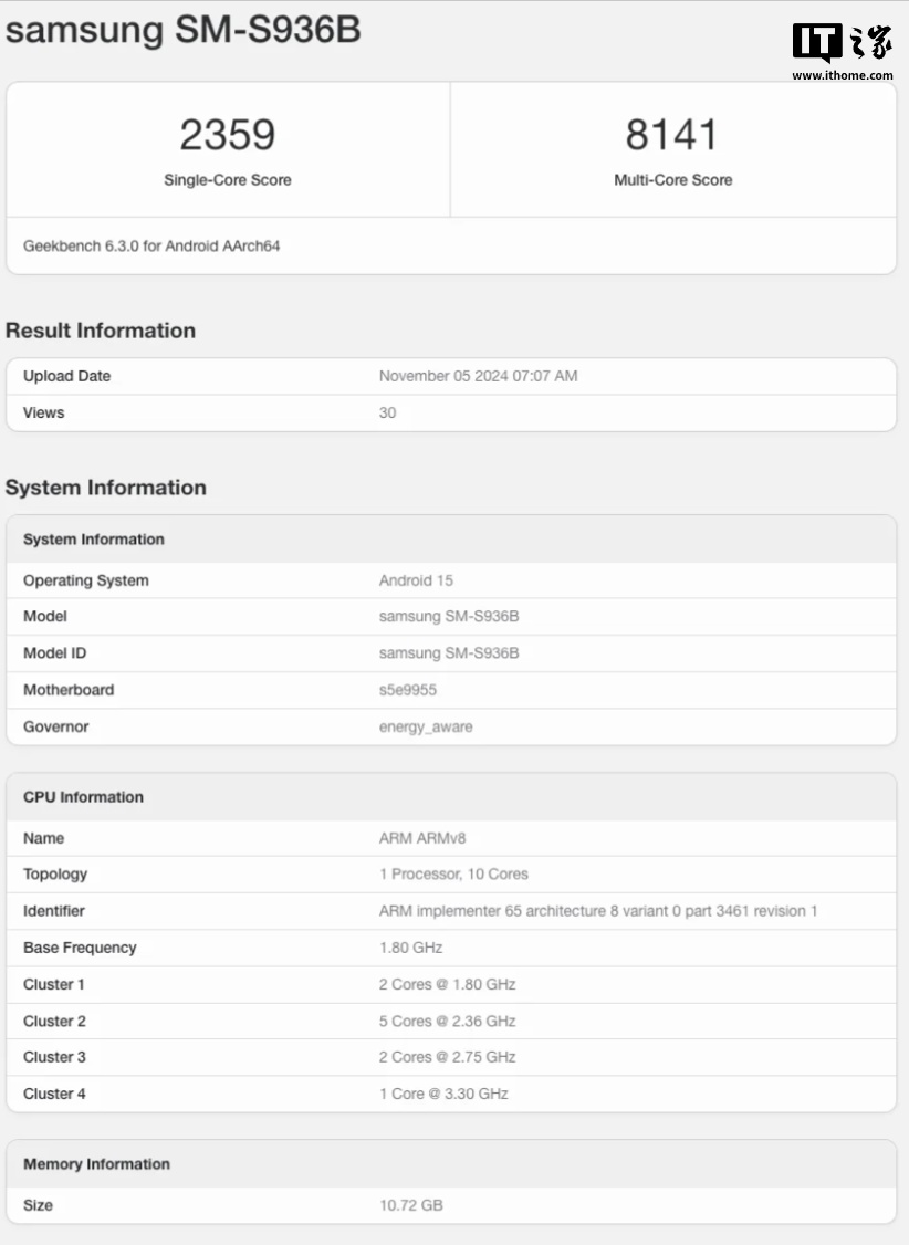 搭载 Exynos 2500 的三星 Galaxy S25+ 手机于今日现身 Geekbench 6 跑分平台,型号为 SM-S936B,用于欧洲市场;单核跑分 2359,多核跑分 8141。