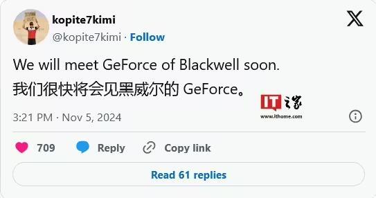 IT之家 11 月 6 日消息,消息源 Kopite7kimi 昨日(11 月 5 日)在 X 平台发布推文,曝料称英伟达“很快”发布 GeForce RTX 50 系列“Blackwell”游戏显卡。