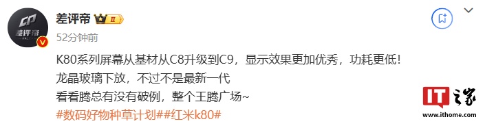 博主 @差评帝 今日发文爆料,小米 Redmi K80 系列手机屏幕基材从 C8 升级到 C9(此处预计指 TCL 华星 C 系发光材料),显示效果提升、功耗降低。新机还将配备龙晶玻璃(非最新一代)。