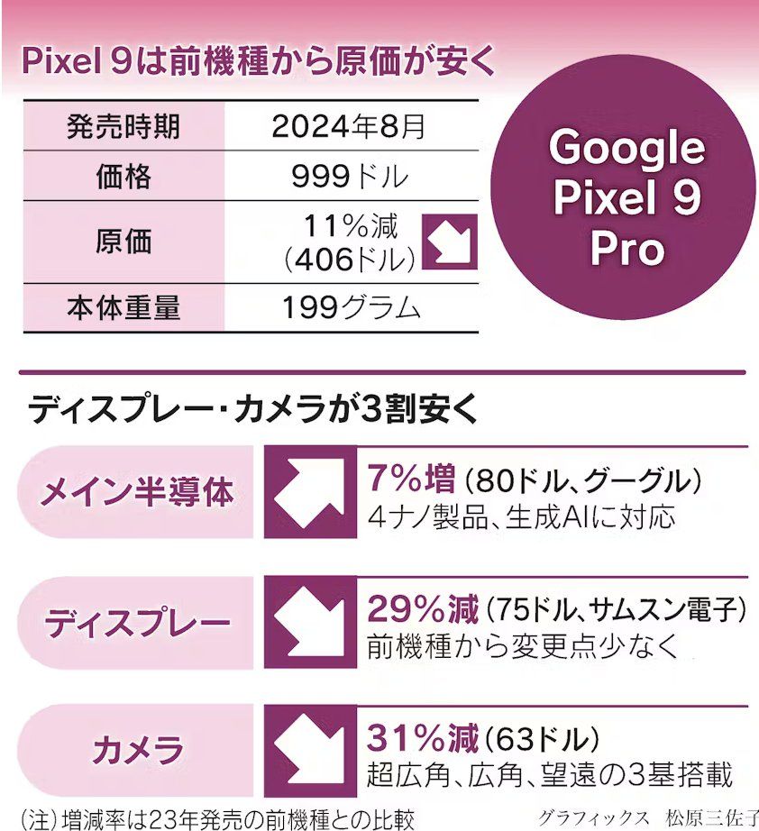 Pixel 9 Pro 手机的芯片成本为 80 美元,显示屏为 75 美元,摄像头组件总计为 61 美元。