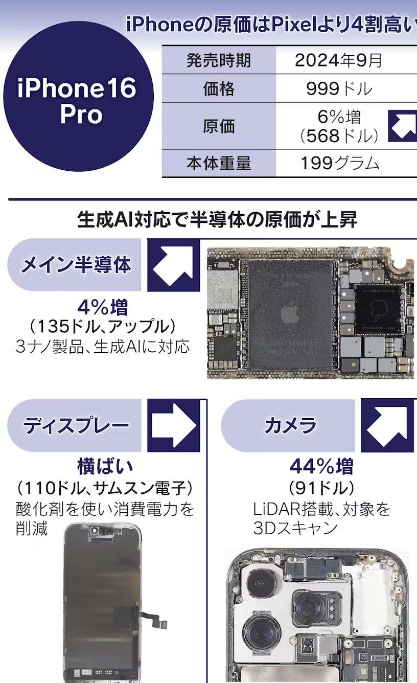 IT之家 11 月 6 日消息,日经新闻携手 Fomalhaut Techno Solutions 公司,分析称苹果 iPhone 16 Pro 和谷歌 Pixel 9 Pro 手机起售价均为 999 美元,但前者的物料成本为 568 美元(当前约 4033 元人民币),后者的物料成本为 406 美元(当前约 2883 元人民币)。