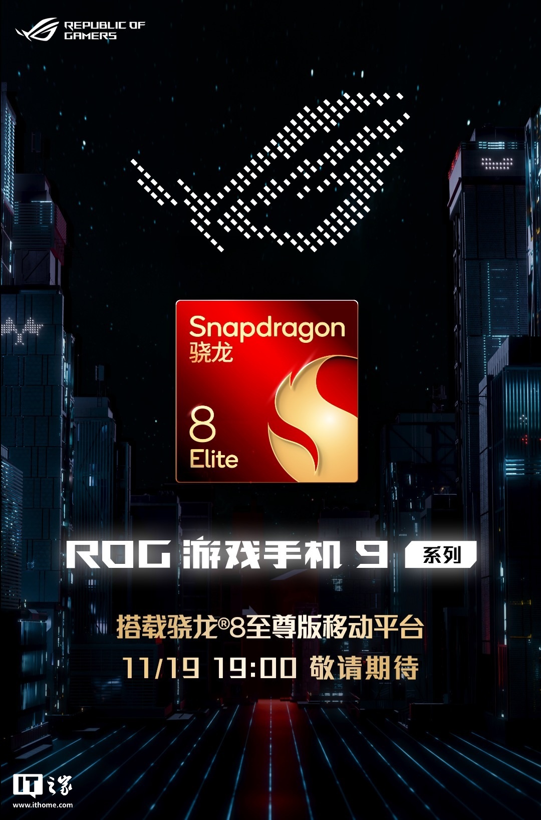 IT之家 11 月 6 日消息,ROG 游戏手机 9 系列已定档今年 11 月 19 日 19:00 发布,新机将搭载全新骁龙 8 至尊版移动平台。