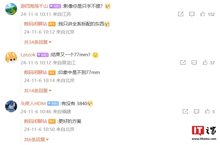 评论区中有网友询问新机宽度是否为 77mm,博主回复称“印象中是不到 77mm”,另有网友询问新机有无“3840”调光方案,博主表示“更好的方案”。
