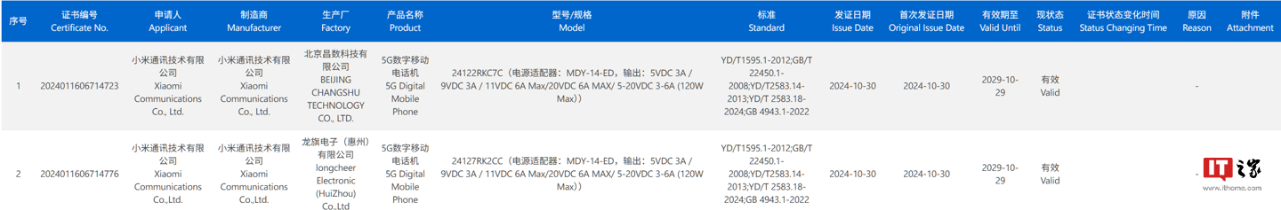 IT之家此前报道,小米 Redmi K80 Pro 手机已于今年 10 月通过国内 3C 认证,规格显示两款机型分别最高支持 120W 和 90W 快充。