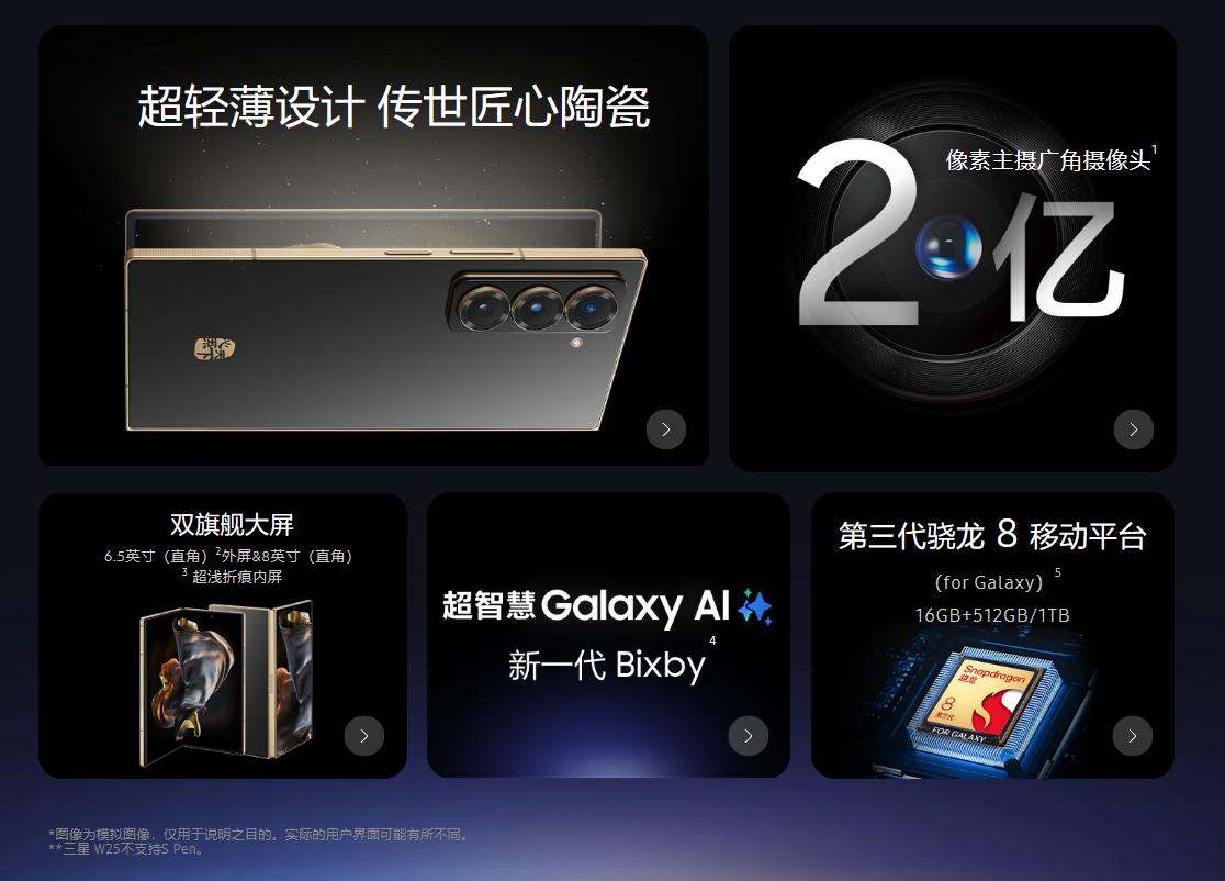 三星 W25 搭载第三代骁龙 8 移动平台(for Galaxy),提供 16GB+512GB / 1TB 存储空间,配备 4400mAh(典型值)电池,具有 IP48 防水性能。
