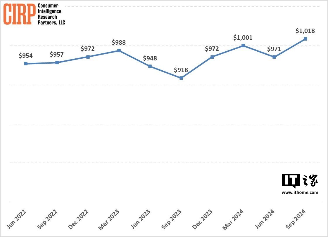 IT之家 11 月 7 日消息,市场调查机构 CIRP 昨日(11 月 6 日)发布报告,称由于消费者更倾向于 Pro 机型,以及对更高存储容量的需求,在美国市场 iPhone 加权平均零售价(US-WARP)达到 1018 美元(IT之家备注:当前约 7229 元人民币)。