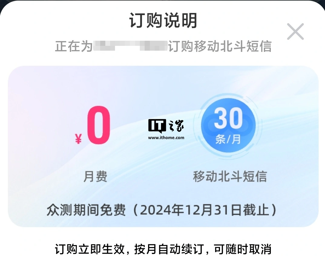 IT之家测试,中国移动用户发送“KTBD”到 10086,或者到中国移动 App、中国移动营业厅即可开通,无需换卡换号就可领取每月发送 30 条的北斗卫星短信服务,接收条数不设限制。