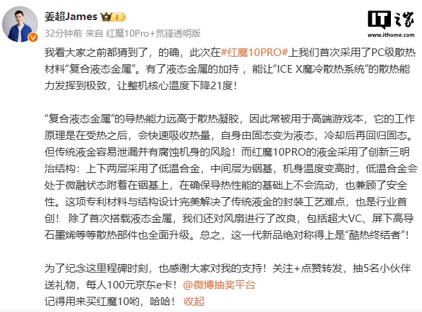 红魔游戏手机产品总经理 @姜超James 介绍称,有了液态金属的加持,能让“ICE X 魔冷散热系统”的散热能力发挥到极致,让整机核心温度下降 21 度。