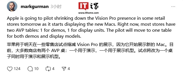 IT之家 11 月 8 日消息,彭博社的马克・古尔曼(Mark Gurman)今天(11 月 8 日)在 Thread 平台发布动态,表示部分苹果线下零售店已减少 Vision Pro 头显的展示空间。