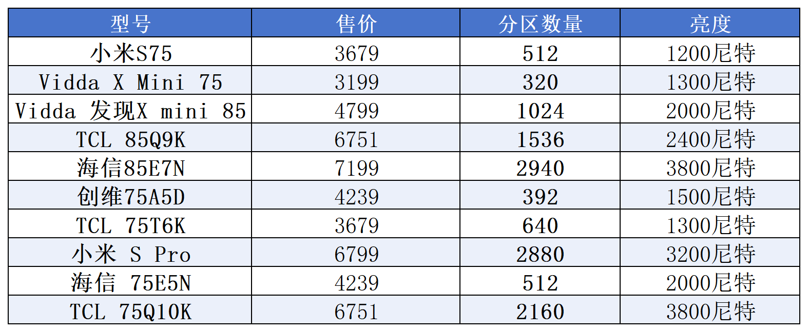 值得注意的是,背光分区数量呈现断层式上涨的产品,大多都是今年新推出的产品,其中超2000分区且价格更具性价比的海信85E7N、小米S Pro等,基本都是9-10月发布的新品。