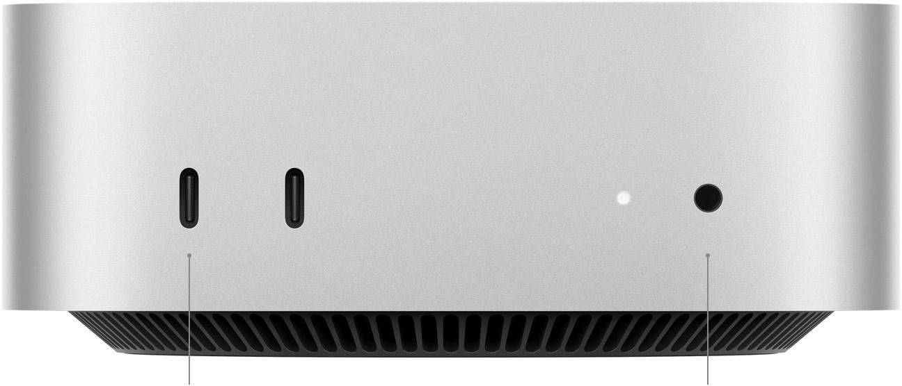 Mac mini M4 机身前面的两个 USB-C 端口(支持 USB 3,速率最高可达 10Gb/s),虽然目前均不能作为受电端口,但苹果的确做好了 Type-C 接口受电在硬件层面的工作(至少是做完了一部分),这个端口其实是所谓的 dual role port,即可以对外供电也可以向内送电。