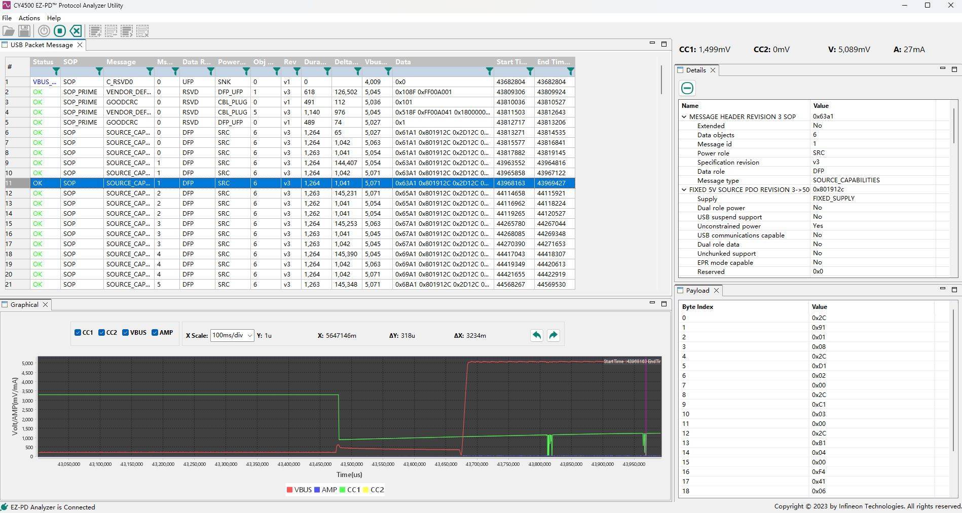 而这个通讯的过程,可以用 Cypress CY4500 EZ-PD 协议分析器抓包,以分析 PD 协议的相互通讯过程。