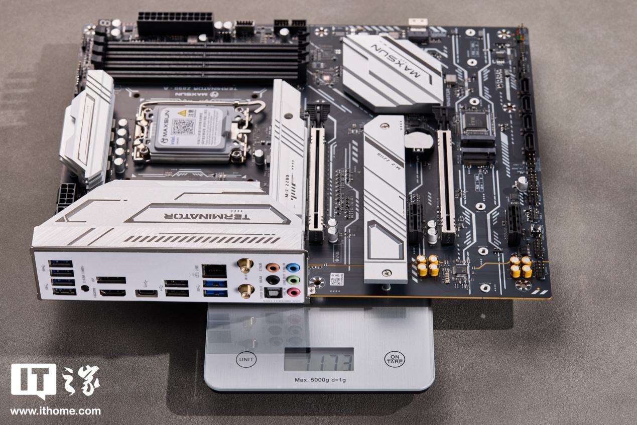 这块主板的为标准的 ATX 大板,尺寸方面IT之家实测长和宽分别为 30.5cmx24.5cm,是一块标准的 ATX 主板,上秤裸板重量则为 1.173kg。