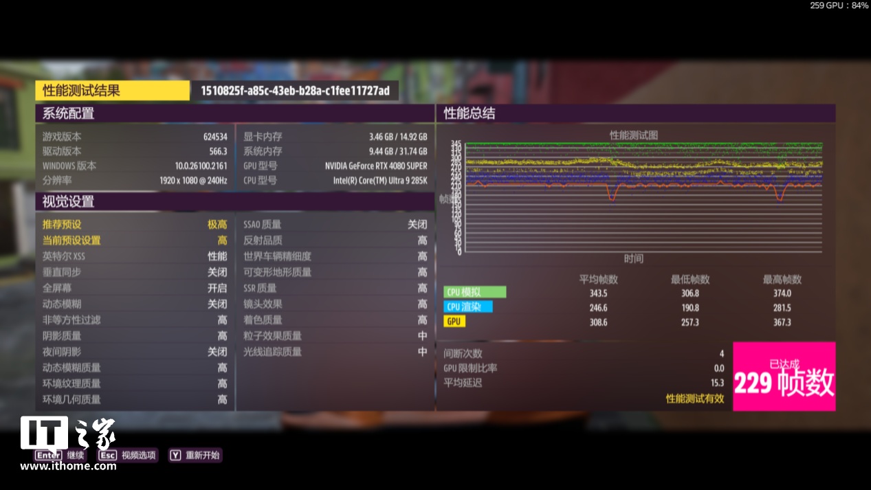 第三款《极限竞速:地平线 5》,选择 1080P 分辨率 + 高画质预设运行游戏自带基准测试,酷睿 Ultra 9 285K 游戏平均帧数为 229 帧。