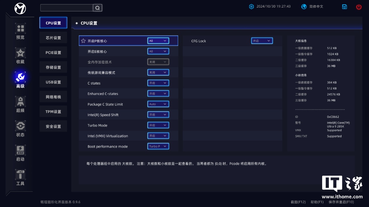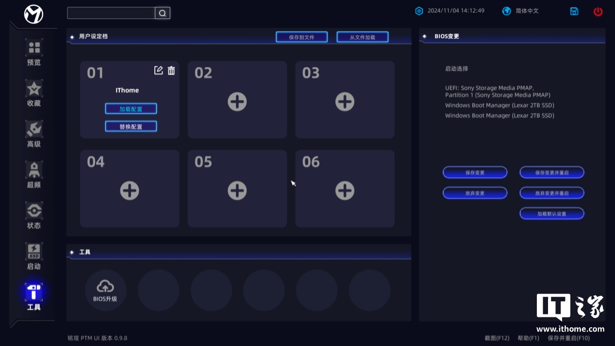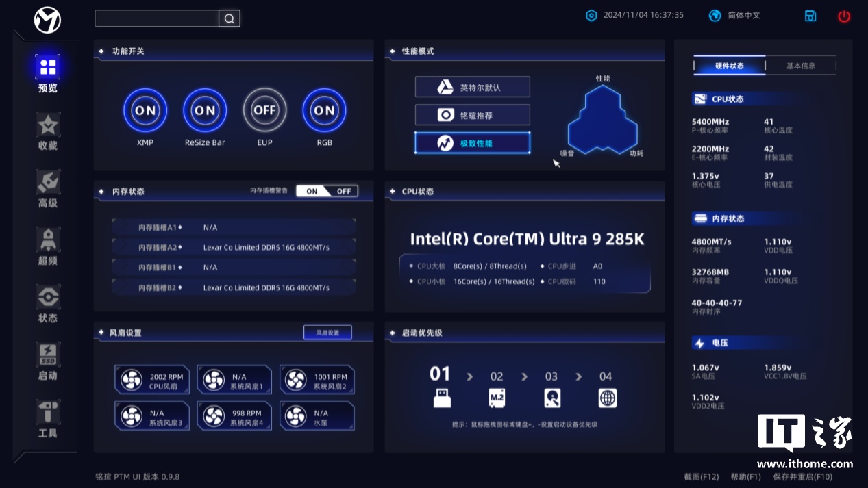 在以前,铭瑄主板的 BIOS 经常被吐槽有“时代感”。而这次伴随铭瑄 Z890 主板新品首发的,还有经过全新设计的 BIOS。改版后的 BIOS 界面以科技感十足的蓝色为主色调,点亮的按钮还有光晕效果,很是精致。