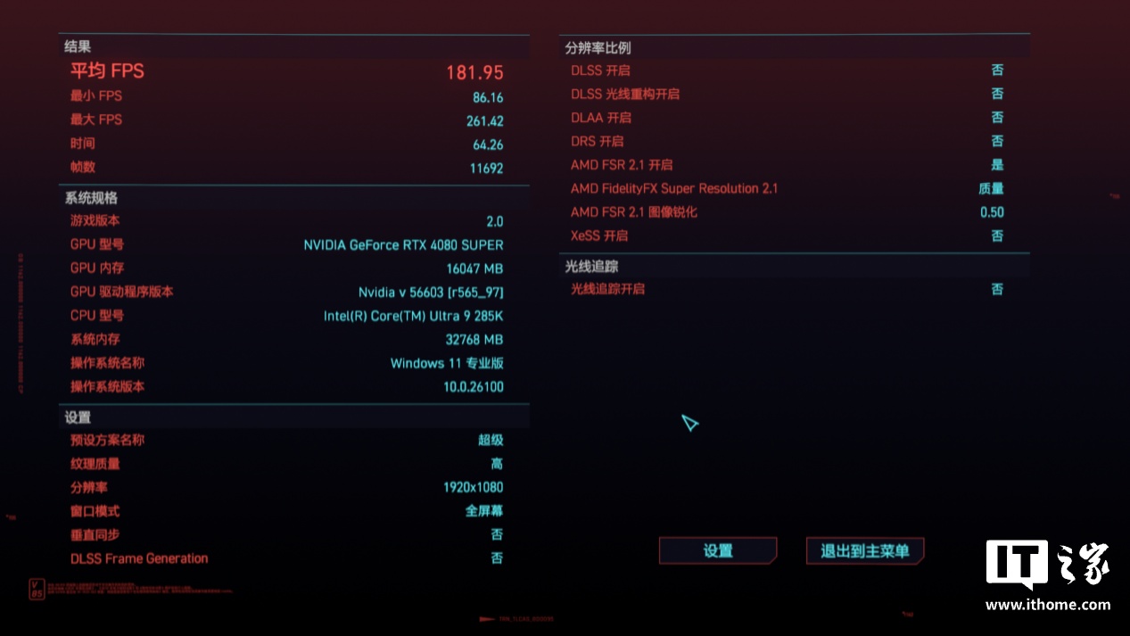 第五款是《赛博朋克:2077》,选择 1080P 分辨率 + 超级画质运行游戏自带基准测试,酷睿 Ultra 9 285K 游戏平均帧数为 182 帧,1% Low 帧 86 帧。