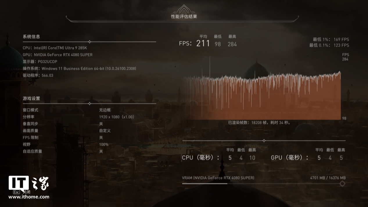 第六款是《刺客信条:幻景》,选择 1080P 分辨率 + 高 + XeSS,并关闭动态模糊,运行游戏自带基准测试。酷睿 Ultra 9 285K 游戏平均帧数为 211 帧,1% Low 帧 169 帧。