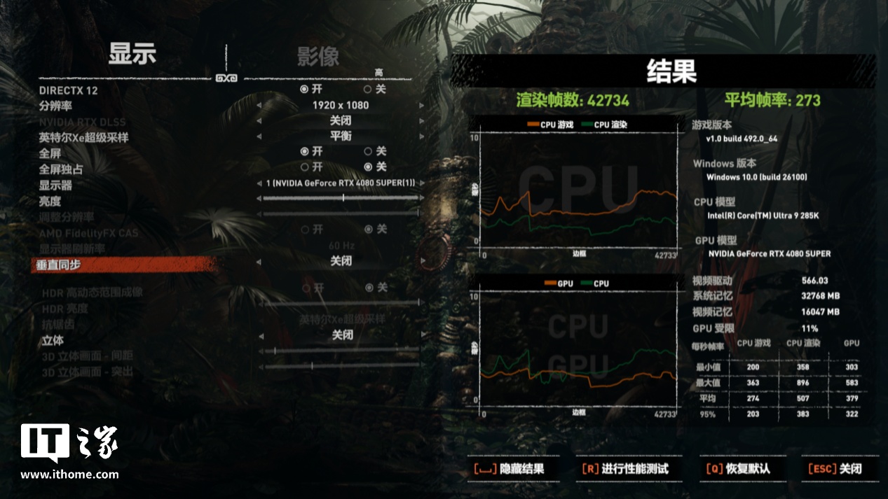 第二款《古墓丽影:暗影》,选择 1080P 分辨率 + 高画质运行游戏自带基准测试,酷睿 Ultra 9 285K 游戏平均帧数为 273 帧,1% Low 帧 200 帧。