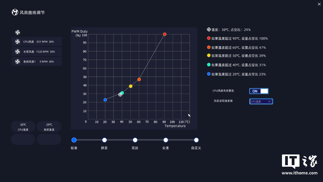 风扇的转速调节界面也很容易懂,有四种预设的转速模式可以选,或者你可以直接自定义,自己手动调整不同温度下的风扇转速。