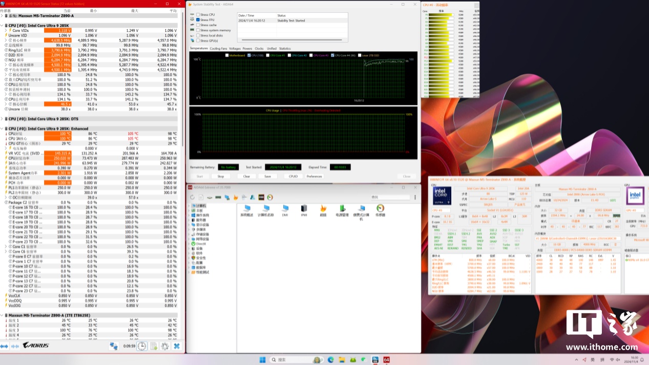 先看烤机,由于铭瑄终结者 Z890-A Wi-Fi 主板的 BIOS 功耗策略比较科学,PL1 直接给到 250W,PL2 无限制。烤机一开始 CPU 功耗冲来到了 287W,CPU 温度也达到了 105°C。随后 CPU 温度降到了 100°C 左右,CPU 功耗也快速稳定在 250W 附近。烤机 10 分钟后,此时 CPU 的 P 核频率最高达到了 5.2GHz,E 核频率则在 4.5GHz 左右。