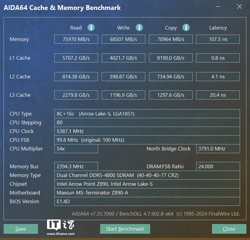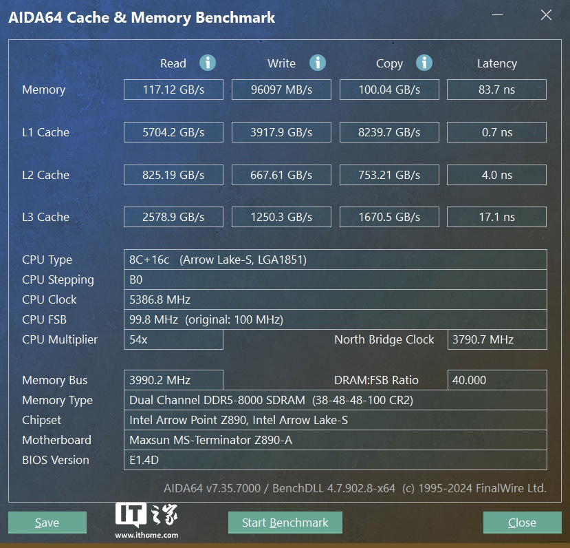 上述成绩属于 4800MHz 频率下的内存正常读写水平,不过大家应该注意到这次的内存延迟受酷睿 Ultra 9 285K 的架构影响,相比上一代 i9-14900K 可能会偏高一点。