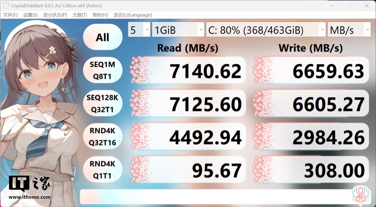 硬盘方面,我们将标称规格为 7450MB/s 顺序读取速度和 6500MB/s 顺序写入速度的雷克沙 NM800 Pro 插在主 M.2 插槽上,在 80% 脏盘的情况下跑到了 7141MB/s 的顺序读取速度和 6660MB/s 的顺序写入速度,符合其应有的水平。