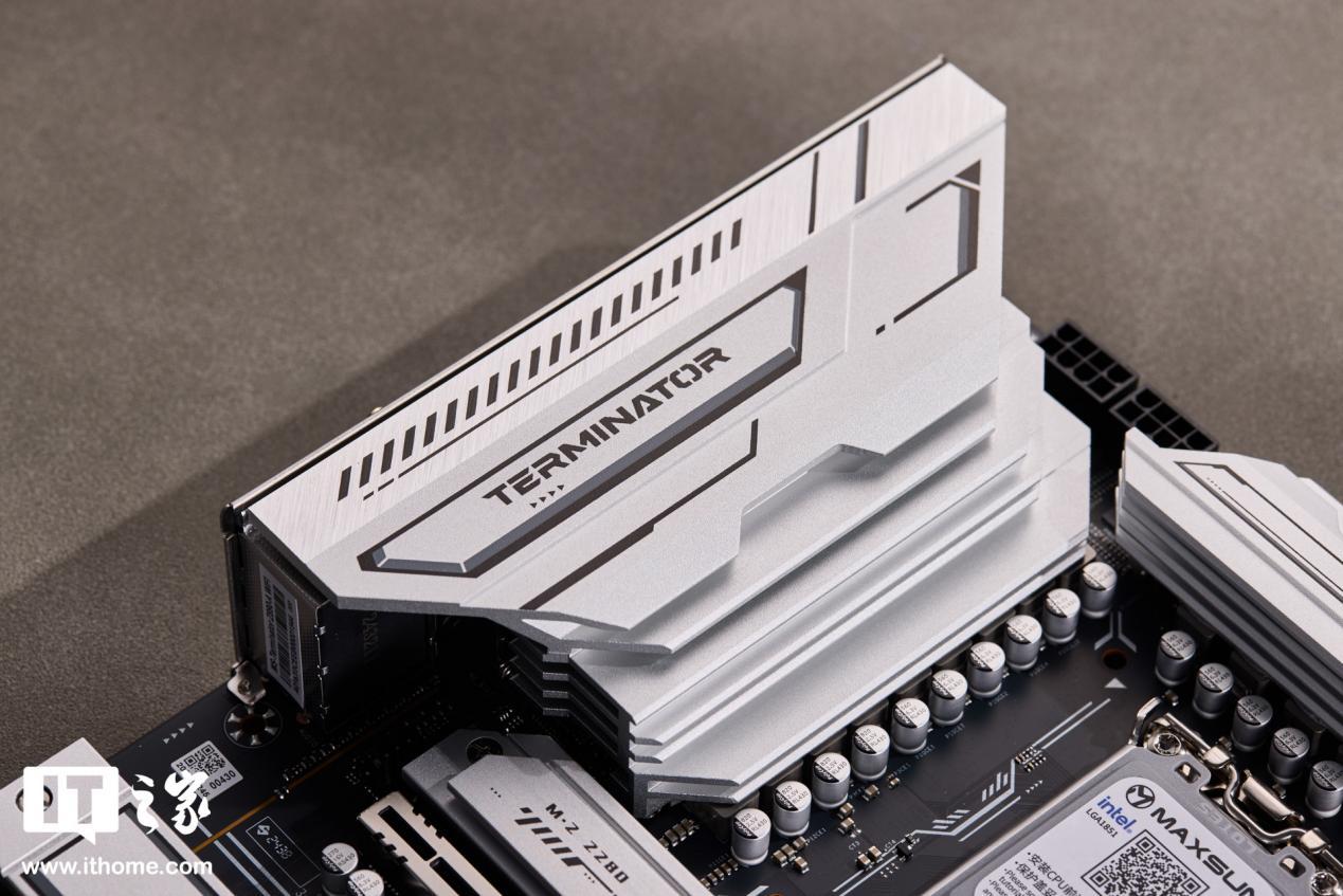 铭瑄终结者 Z890-A Wi-Fi 主板的 PCB 部分为黑色涂装,铝合金的装甲部分则是银白色,并有黑色线条装饰,极具科技与速度感。