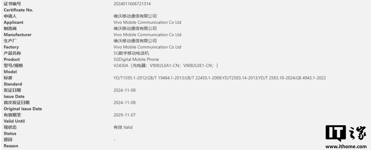 IT之家 11 月 9 日消息,昨天有一款型号为 V2430A 的 vivo 新机通过了国家 3C 质量认证,@数码闲聊站 称其为 vivo S20 Pro,配备 X200 系列同款 90W 充电器。