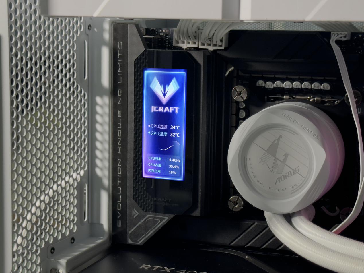 主板左侧装甲区域配备了一块 3.4 英寸 LED 锐影屏。用户可通过铭瑄视界应用程序,选取多种预设的主题图案,这些主题可以显示 CPU 温度等系统信功能。此外,该屏幕还支持用户对每种主题的显示内容进行定制,或是设置个性的开机动画。