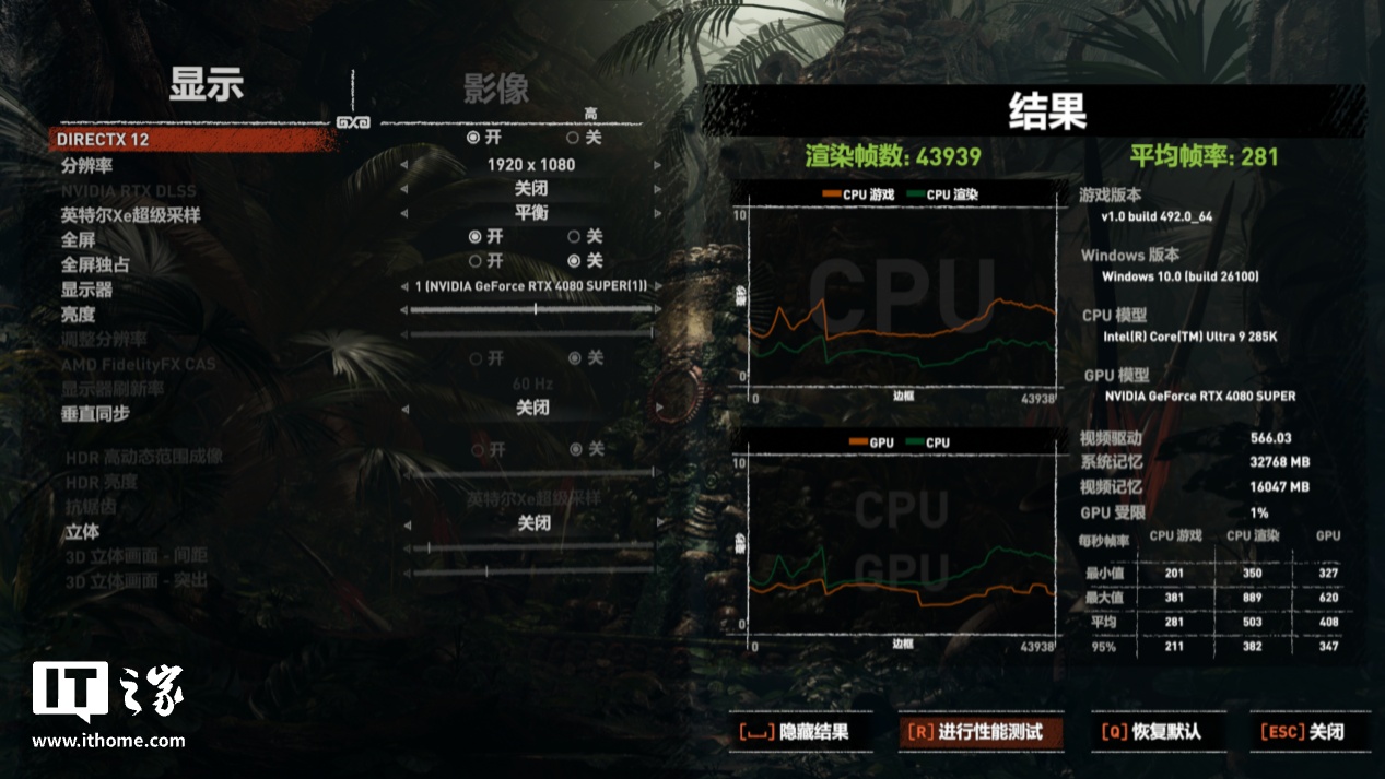 第二款《古墓丽影:暗影》,选择 1080P 分辨率 + 高画质运行游戏自带基准测试,酷睿 Ultra 9 285K 游戏平均帧数为 281 帧,1% Low 帧 201 帧。