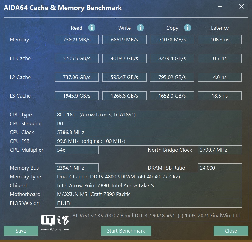 上述表现符合 4800MHz 频率下内存的表现,然而受酷睿 Ultra 9 285K 架构设计的影响,相较于上一代产品 i9-14900K,可能存在一定程度的偏高现象。