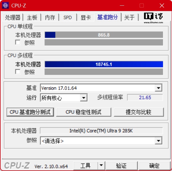 接下来进入理论性能实测,在 CPU-Z 自带的跑分测试中,酷睿 Ultra 9 285K 单核心 865.8 分,多核心 18745.1 分。