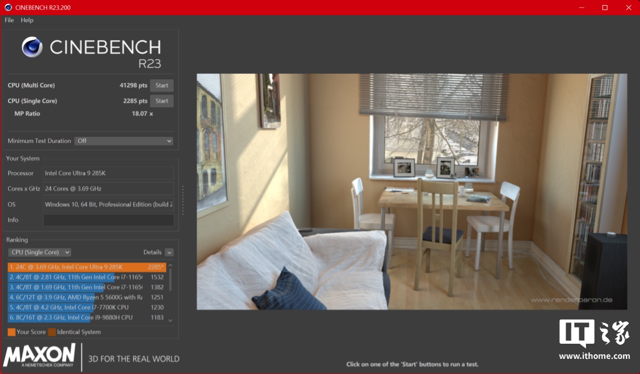 在 CineBench R23 的测试中,酷睿 Ultra 9 285K 跑出了单核 2285 分,多核 41298 分的成绩。