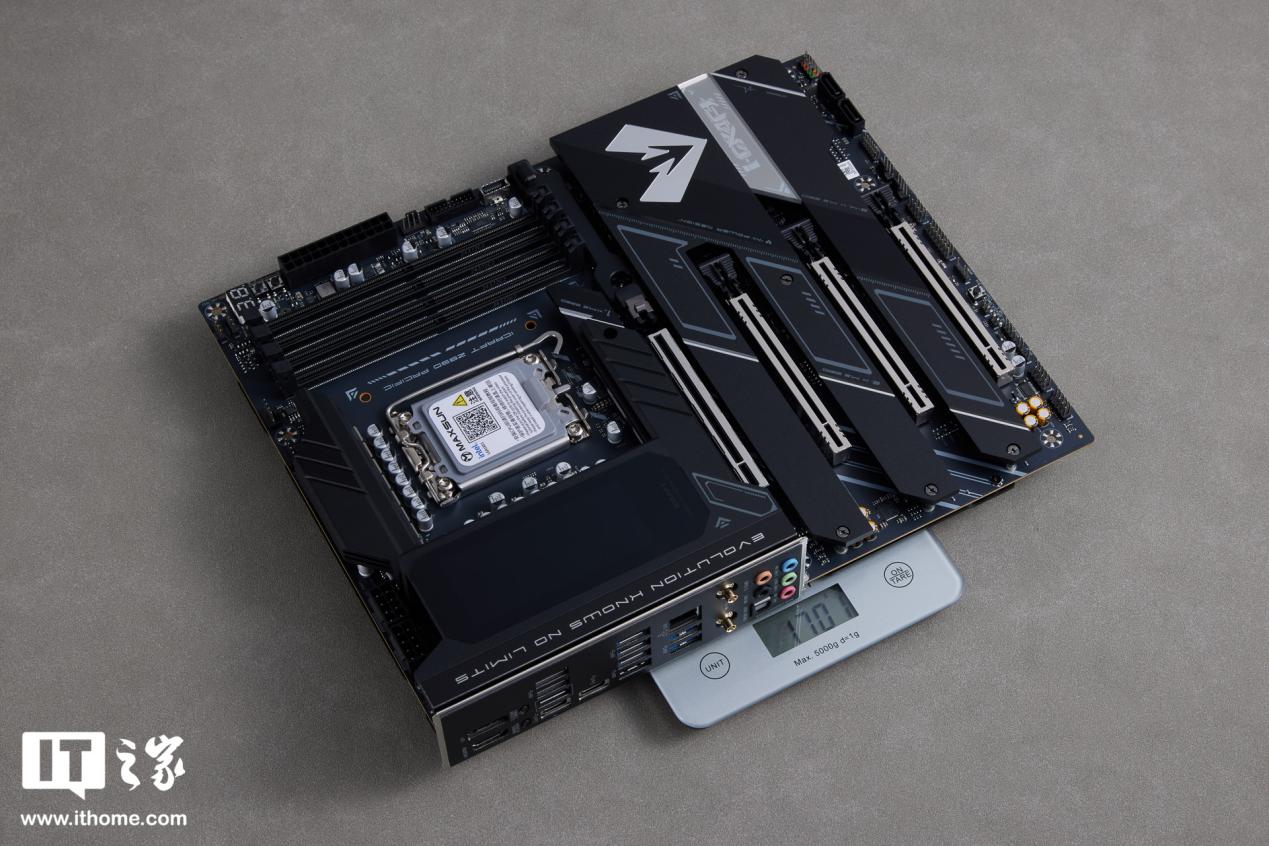 这块主板的为标准的 ATX 大板,尺寸方面IT之家实测长和宽分别为 30.5cmx24.5cm,上秤裸板重量则为 1.7kg。