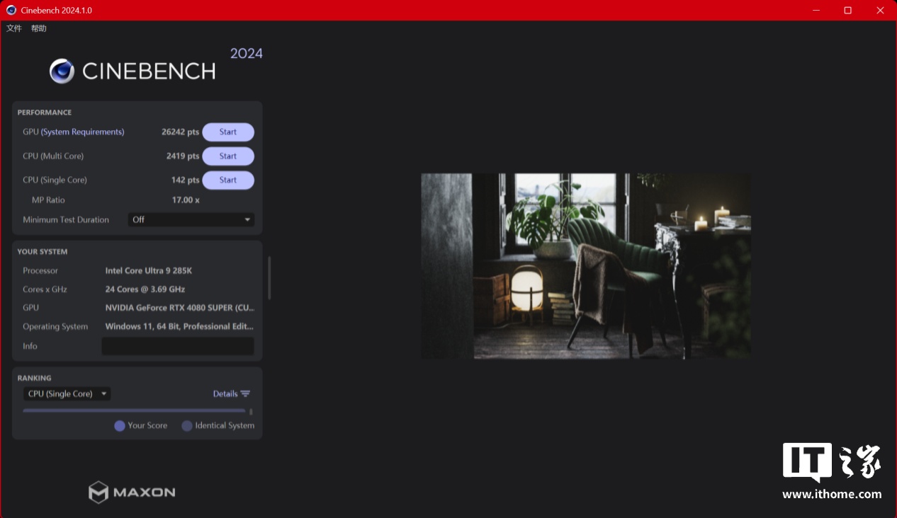 在 CineBench 2024 测试中,酷睿 Ultra 9 285K 获得了单核 142 分,多核 2419 分的成绩,表现较为出色。
