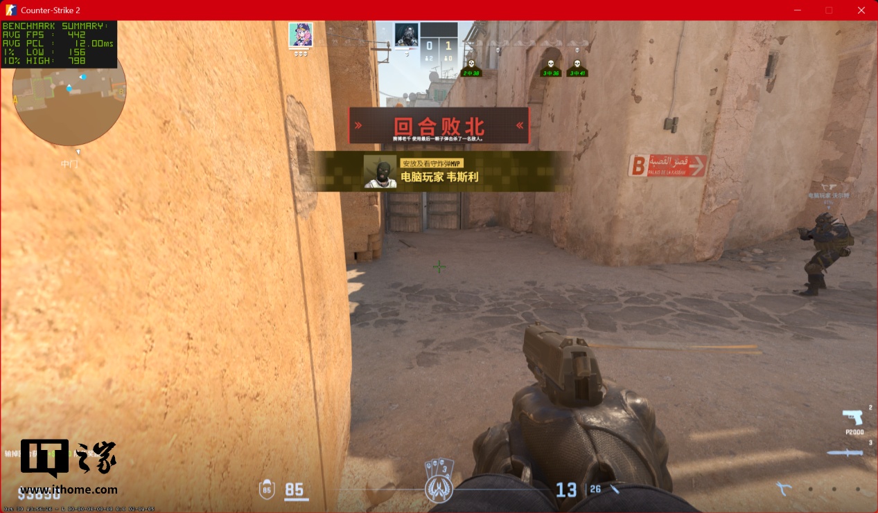 第一款《CS2》,以 1080P 分辨率 + 高画质运行创意工坊测试地图,酷睿 Ultra 9 285K 游戏平均帧数为 442 帧,1% Low 帧 156 帧。