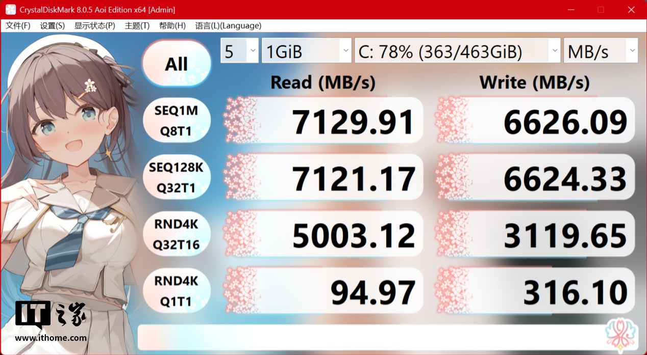 硬盘方面,我们将标称规格为 7450MB/s 顺序读取速度和 6500MB/s 顺序写入速度的雷克沙 NM800 Pro 插在主 M.2 插槽上,在 78% 脏盘的情况下跑到了 7129.9MB/s 的顺序读取速度和 6626.1MB/s 的顺序写入速度,符合其应有的水平。