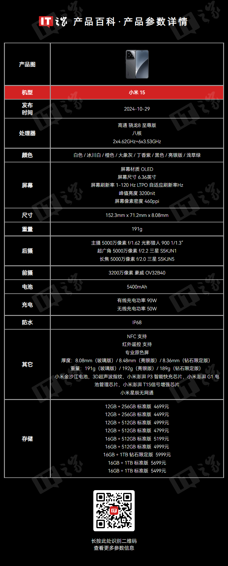 小米 15 手机发售于 2024 年 10 月 29 日,12GB + 256GB 起步,定价 4499 元起。
