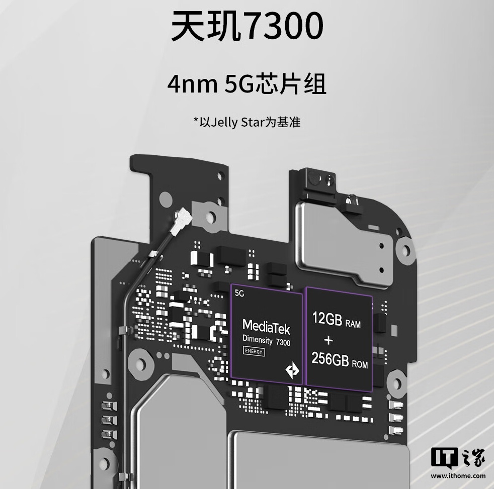 性能方面,Jelly Max 搭载天玑 7300 处理器(2.5GHz 4x A78 + 4x A55、Mali-G615 MC2、4nm 制程)与 12GB LPDDR5 + 256GB UFS 3.1 的内存组合。